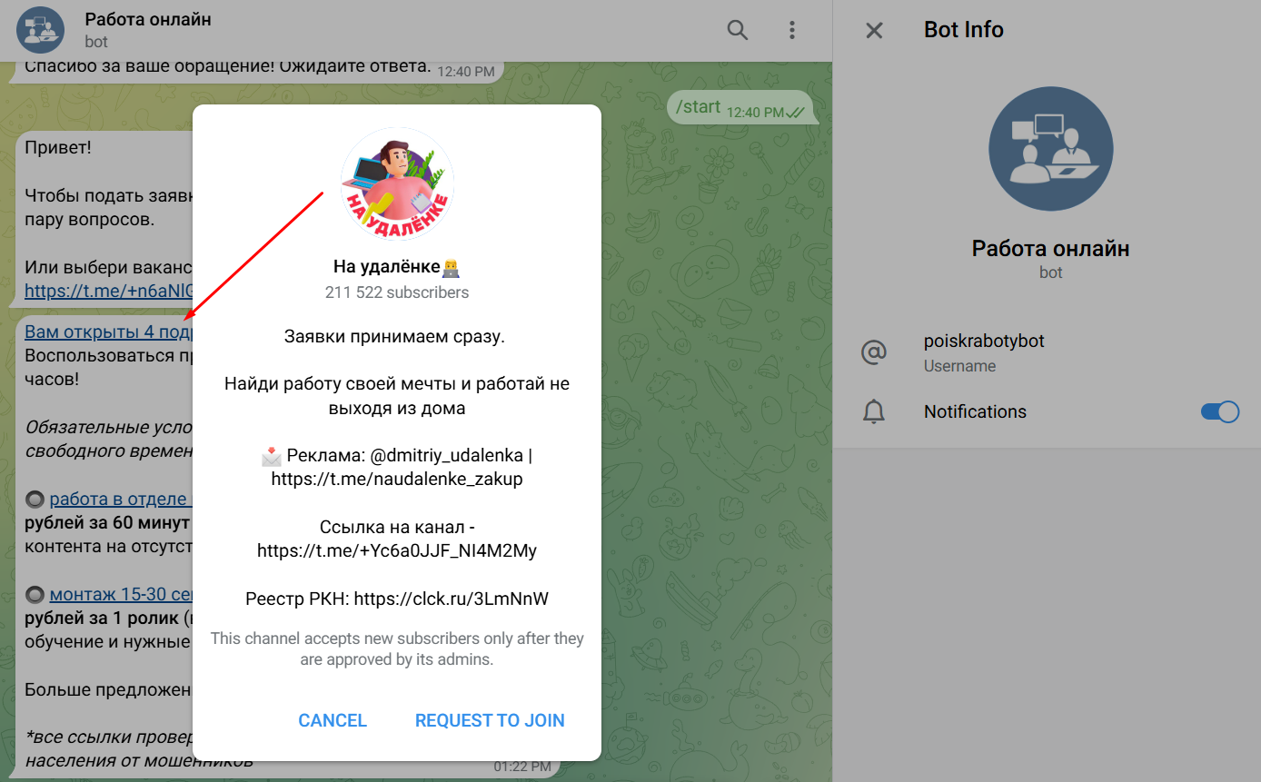 Что касается личного телеграм бота от Лизы Жемчужной, то помимо долгого ожидания работы и обратной связи, вместо предложений клиентам начинают поступать спам сообщения. Таким образом Елизавета дополнительно продвигает сомнительные каналы, которые работают по идентичной схеме, из-за чего во всей этой цепи крайне сложно найти реальные вакансии. Также часто она просто продвигает реферальные ссылки на HeadHunter, за что получает дополнительные выплаты.