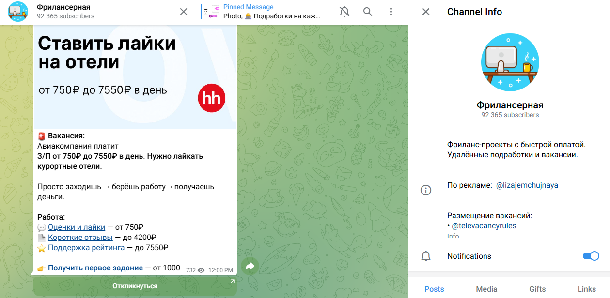 Фрилансерная телеграмм канал отзывы в сети не получает, а владельцы проекта публикуют большое количество удаленных вакансий, которые якобы позволят выйти на стабильный доход. Также они продают рекламу сторонних способов заработка, где цена поста начинается от 7000 рублей. По их словам менеджеры фильтруют поступающие предложения и на скам наткнуться невозможно, но стоит ли доверять, узнаете в данной статье.