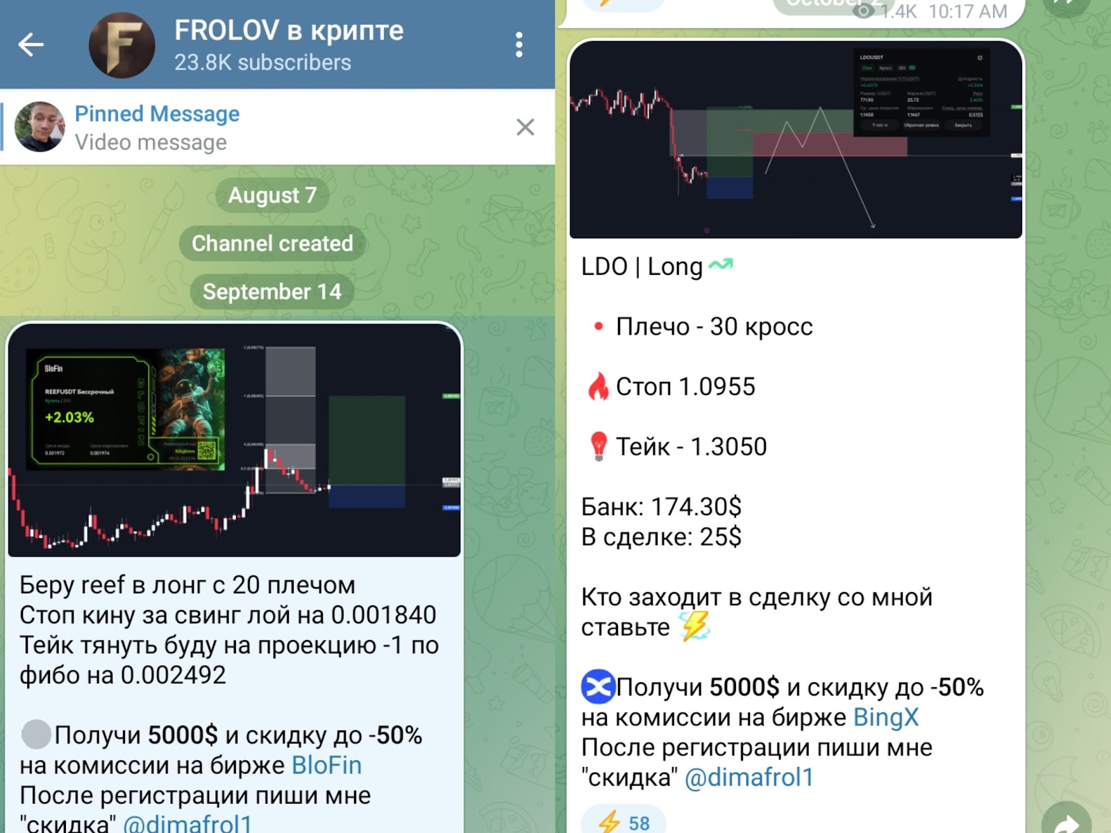 Во время анализа проекта по крипте мы выяснили, что Дмитрий Фролов регулярно продвигает партнерскую ссылку для создания аккаунта на BingX. Партнеров привлекает 50% скидками и прочими бонусами. На самом деле с помощью рефералов трейдер будет получать доход. Из услуг автор предлагает оформить подписку на ВИП группу с сигналами. Однако стоимость входа не обозначена. Детали условий работы с трейдером не написаны. По всем вопросам нужно обращаться к админу dimafrol1 (Dmitry Frolov).