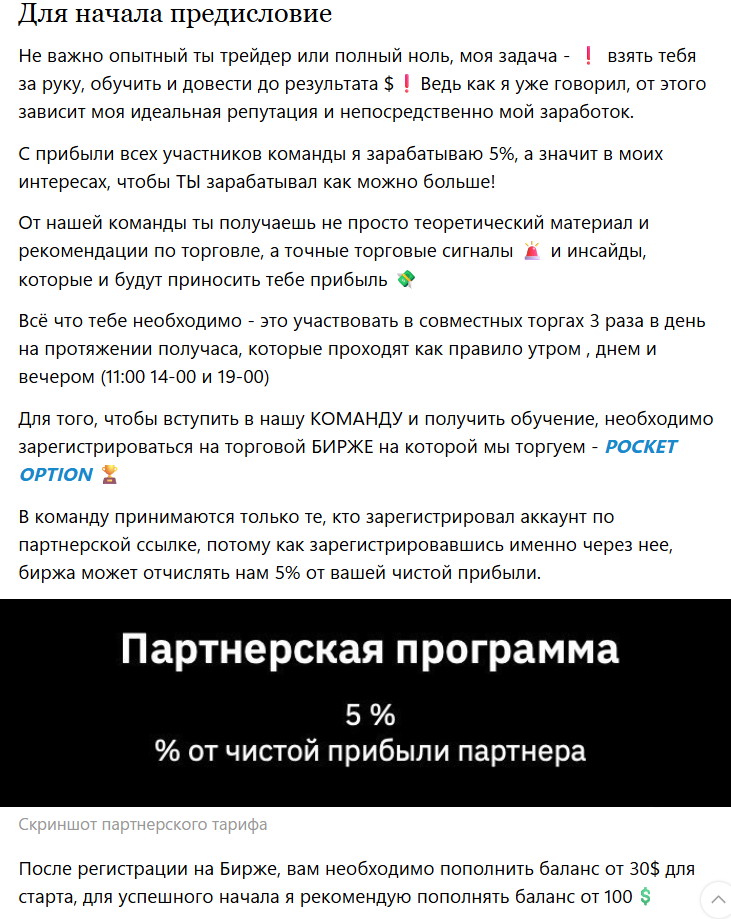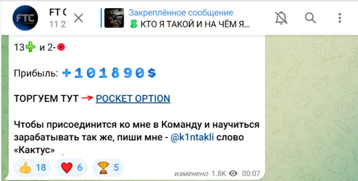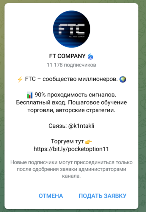 Все услуги телеграм-канала «ФТ Компания» бесплатные. Даром на это ресурсе можно получить ссылки на биржу и призывы присоединяться к ВИП-клубу. Бесплатно автор обещает высокую прибыль. За деньги он работает с участниками ВИП-клуба. Стать частью закрытого комьюнити на платной основе можно после личного обращения к трейдеру и регистрации на указанной им торговой платформе.