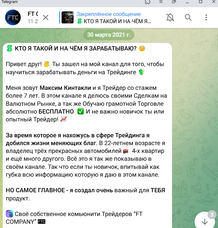 В ленте канала FT Company вы не найдете базовых и профессиональных методов торговли. Здесь не демонстрируют анализов рынков и криптовалют, нет аналитики, верифицированной статистики, которая подтверждает 90% проходимости сигналов. Нет и других материалов от настоящих трейдеров. На основе вышесказанного складывается впечатление, что Максим Кинтакли вовсе не эксперт в трейдинге, а вся его деятельность – банальный развод новичков.