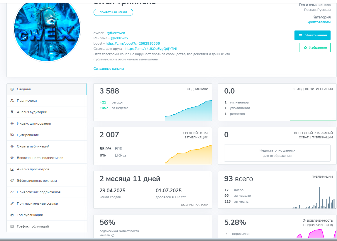 Несмотря на короткий срок существования, он уже собрал 3 588 подписчиков и продолжает стабильно расти: за неделю прибавилось 457 человек. Активность внутри канала высокая: за месяц опубликовано 213 постов, из которых 96 только за последнюю неделю.