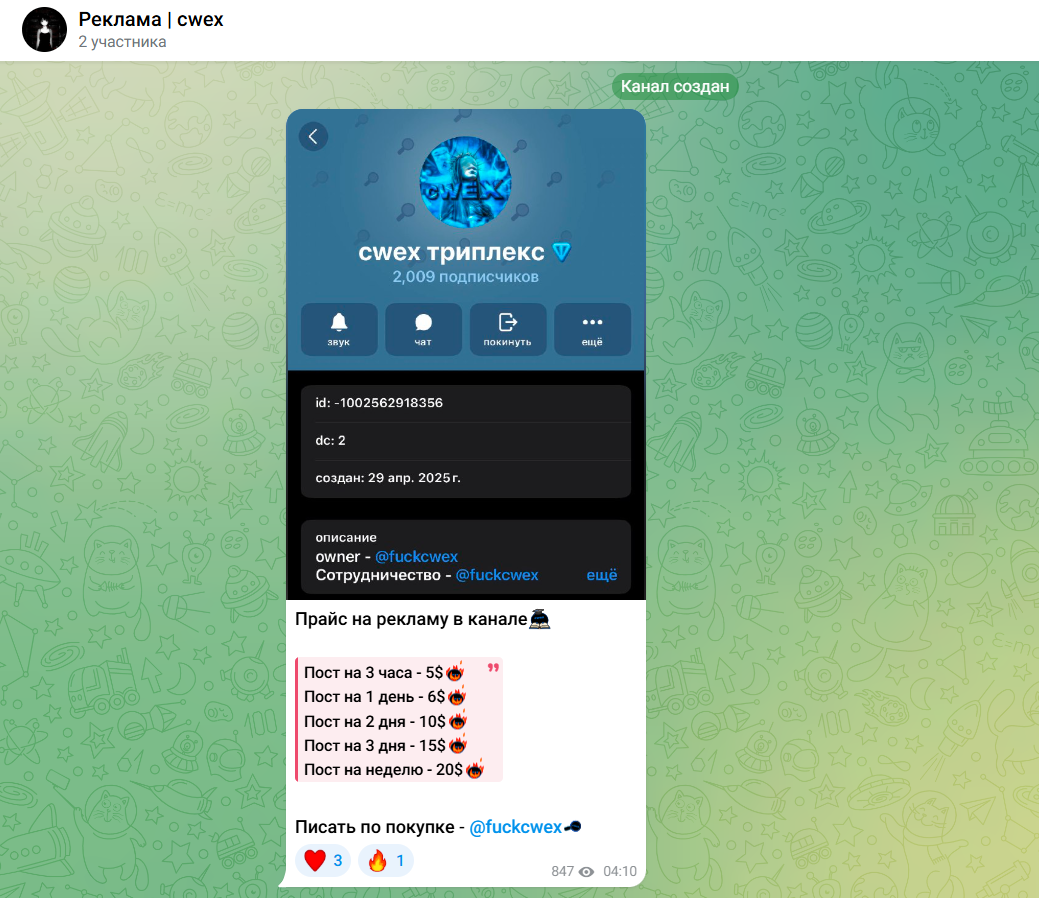 • Размещение сторонней рекламы на канале CWEX ТРИПЛЕКС: от 5 до 20 долларов за пост.