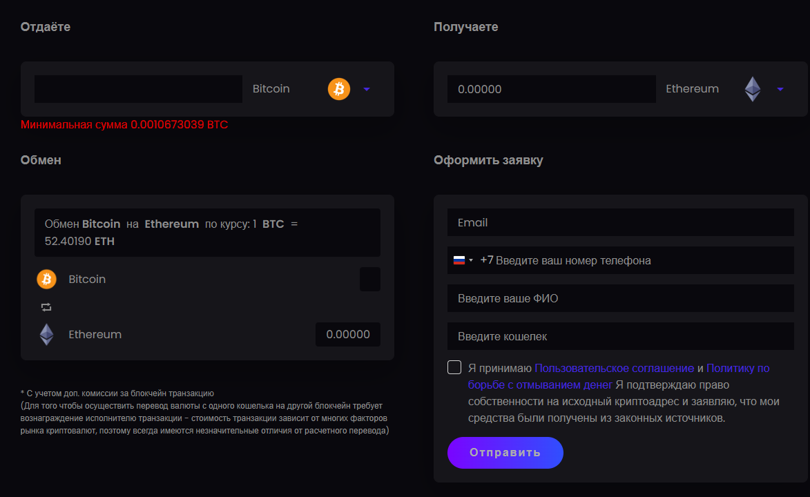 Для проведения обмена пользователю нужно ввести свою электронную почту, номер телефона, ФИО и номер кошелька. Плюс нужно ознакомиться с Пользовательским соглашение и Политикой по борьбе с отмыванием денег.