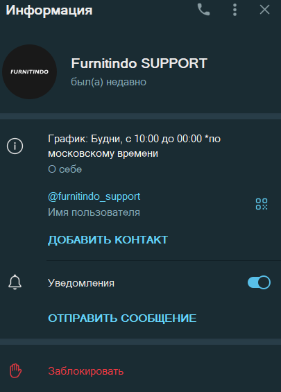 Сам сайт представлен в виде одностраничного лендинга и доступен только на русском языке.Техподдержка работает через аккаунт в Телеграмм с ником Furnitindo support. При этом она работает только по будням с 10:00 до 00:00.