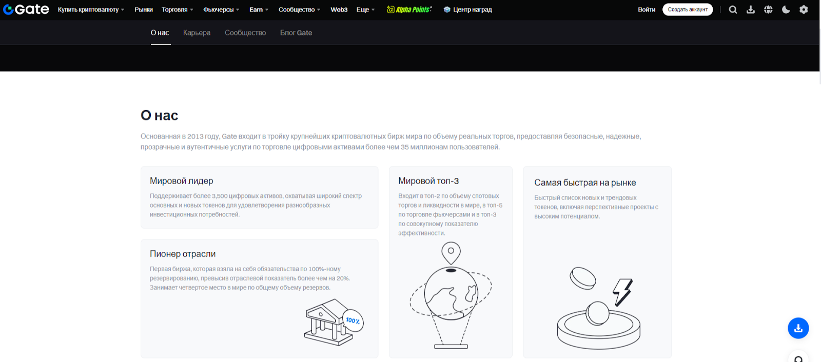 Портал криптовалютной биржи не отличается оригинальностью дизайна. Доверия оформление веб-сайта не вызывает. На главной странице ресурса в хедере размещены вкладки «Купить криптовалюту», «Рынки, «Торговля», «Фьючерсы», Eam, «Сообщество», Web3, «Центр наград». Футер знакомит гостей с разделом «Лицензия», в котором представлены ссылки на юрисдикции TCSP, GFSC, VFA, OAM, AUSTRAC, CySEC и т. д. Данными юрисдикциями регулируется деятельность компании Gate Technology Ltd с 2019-2021 года. Вкладка «О нас» рассказывает о том, что организация существует с 2013 года.