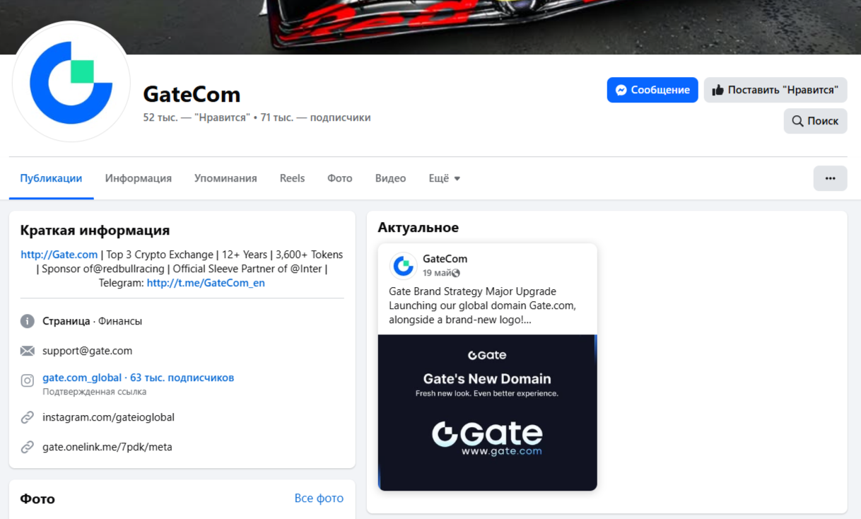 Профил GateCom EN можно увидеть на Facebook. На него подписано 52 000+ пользователей. Публикации в профиле носят рекламный характер. В ленте можно увидеть посты о преимуществах торговой платформы и мероприятиях компании.