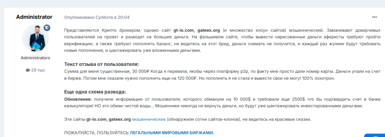 За два года своего существования площадка для торговли криптой не получила положительных комментариев. При этом все упомянутое время администрация занималась агрессивной рекламой в интернете. В сети мы не нашли о сайте gate com отзывы, в которых бы были написаны благодарности за ВИП-клуб, выгодные комиссионные сборы, партнерку, лучшие условия сотрудничества.
