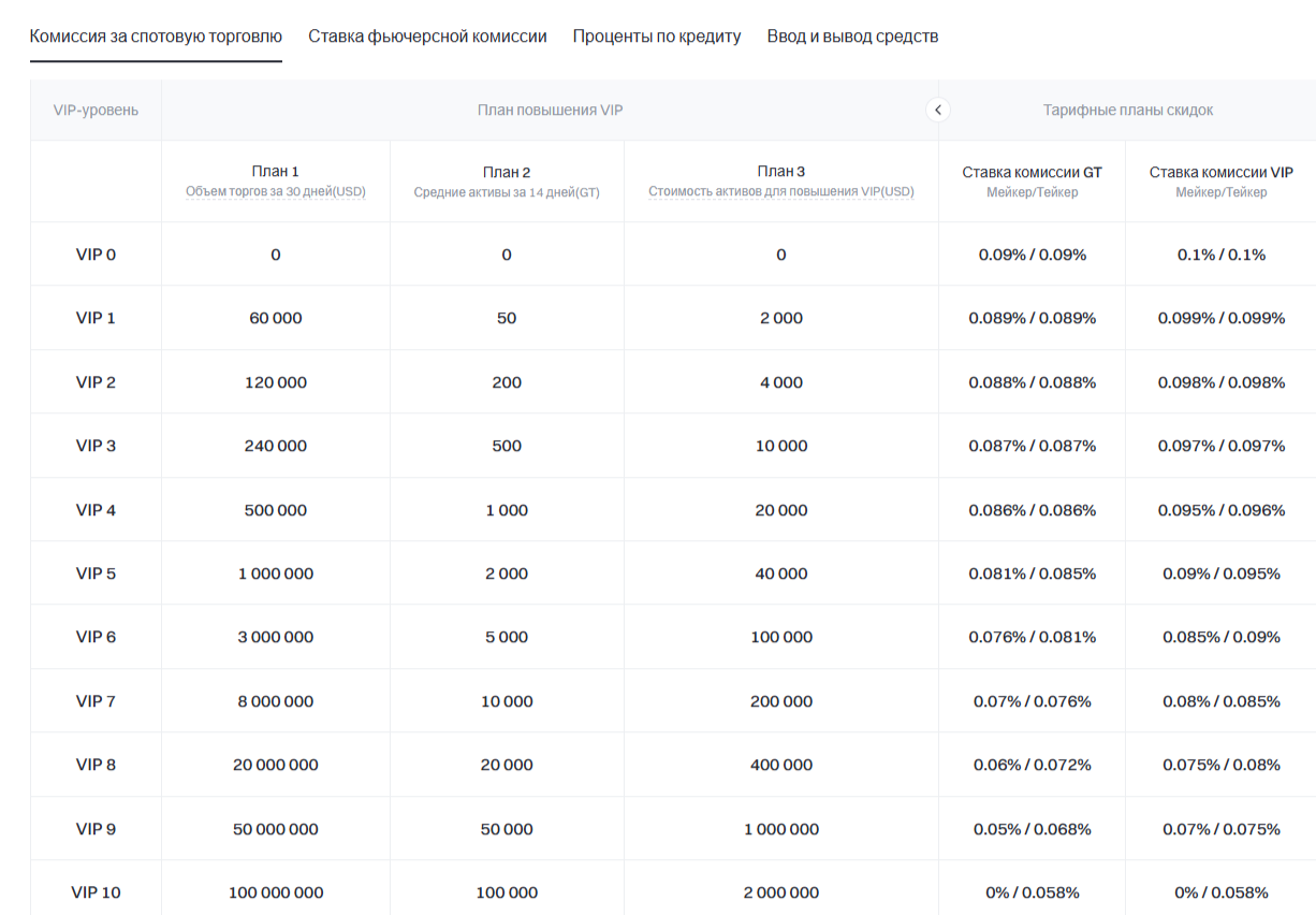 О тарифах торговой платформы gateexchange пользователям расскажет раздел «Комиссии». Здесь представлена информация о комиссиях за спотовую торговлю, ставках фьючерсных комиссий, процентах по кредиту и сборах за ввод и вывод средств. В упомянутом разделе можно узнать, что ставки комиссионных сборов зависят от уровня ВИП.