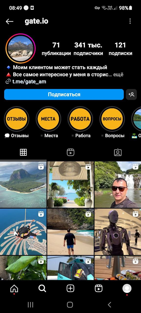 Gate am — Телеграмм аккаунт трейдера, общение с клиентами он ведет только в ТГ. А рекламирует услуги в Инстаграм Инвестирую | Путешествую. Чтобы создать видимость надежного партнера, блоггер использует имя Gate Io. На аккаунт подписано более 300 000 человек, контент состоит из красивых видов разных стран, фото дорогих отелей, авто и прочих атрибутов дорогой жизни. Комментировать публикации нельзя, профиль закрытого типа.