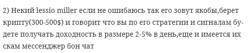 Если вы уже сотрудничали с Lessio Miller, пожалуйста, поделитесь своим опытом в комментариях. А ещё зайдите на наш сайт и посмотрите обзоры проверенных площадок, чтобы зарабатывать на крипте без особой тревоги.