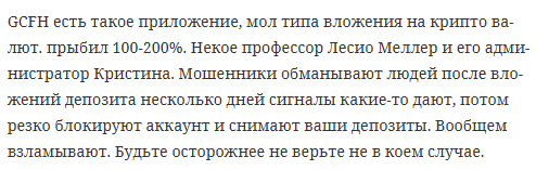 Создатели позиционирует GCFH как платформу для вложений в криптовалюту с обещанием высокой доходности. В качестве эксперта фигурирует некий «профессор» Лесио Меллер (альтернативная транслитерация имени – Lessio Miller) и администратор по имени Кристина. В момент нашего обзора площадка уже была не доступна в сети. Поэтому мы полагаемся на информацию из открытых источников.