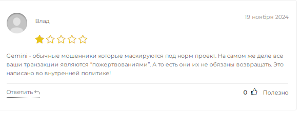 - есть негативные отзывы о телеграм-боте Gemini, которые указывают на то, что этот проект – скам.
