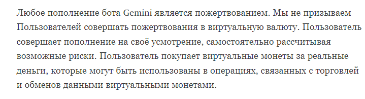 - в пользовательском соглашении Gemini Moonbase LLC прописано, что все деньги, которые ввели в бота, являются пожертвованиями, ваши средства могут не вернуть;