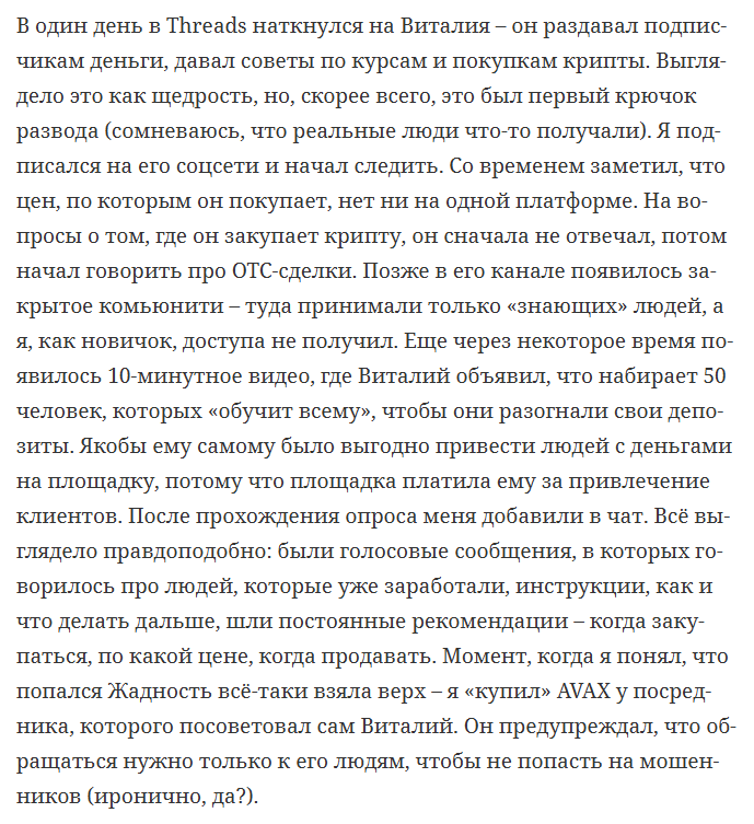 Поэтому за ответами о надежности и качестве лучше всего обращаться к сторонним ресурсам. Так, например, на портале «Вкладер» опубликован длинный отзыв человека, который решил попробовать купить криптовалюту у назначенного Виталием контрагента. Как итог — потерянные деньги и игнор в дальнейшем.