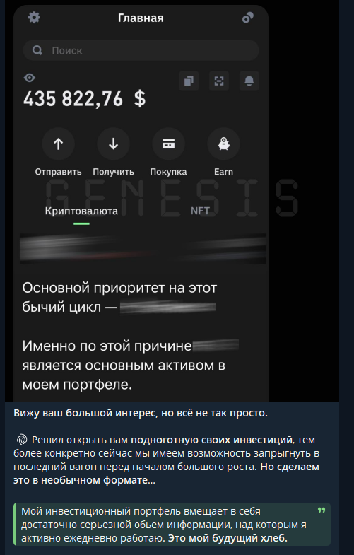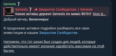 В тг канале Genesis есть место и откровенному маркетингу. На некоторых скриншотах создатель намеренно замазывает самые интересные части текста, призывая вступить в какой-то закрытый канал.Платных услуг здесь замечено не было. Автор иногда размещает свои реферальные ссылки, по которым имеет определенный доход, а также призывает вступить в закрытое сообщество. Вход в него бесплатный, однако для получения доступа заявка должна быть принята администратором. Неясно. что настолько закрытого в этом канале, если приглашение в него размещено для всех желающих. Оценить его содержание, к сожалению, не получилось.