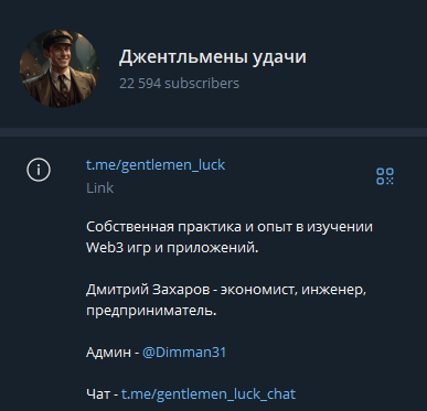 Джентльмены Удачи – это телеграм-канал, связанный с проектом по раскрутке депозитов и рекламе финансовых сигналов. за каналом стоит Дмитрий Захаров — экономист, инженер и предприниматель, который занимается изучением Web 3‑игр и приложений. То есть, основной фокус канала — подача авторских материалов по практике и опыту в Web3‑сфере, включая игровые проекты, где можно зарабатывать через внутриигровые токены, NFT и напоминающие механики. В описании проекта упоминаются администратор @Dimman31 и чат поддержки @gentlemen_luck_chat, однако подробностей о профессиональном опыте команды и реальных результатах операций почти нет.