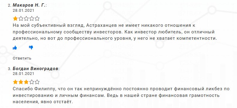 Хотя сам автор курсов глав инвест заявляет, что у него училось 60 000 студентов, по отзывам этого не скажешь. В сети незначительное количество откликов и комментариев, которые дают понять уровень образовательной программы и степень ее полезности для потребителя. Не все довольны профессиональным уровнем Филиппа Астраханцева в области трейдинга, и соответственно его советами.