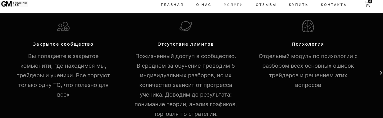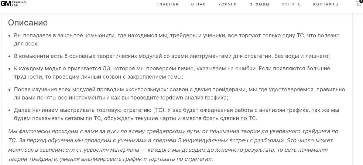 К вышеупомянутому добавим, что представители платформы по обучению GM trading lab используют базовую систему прогрева. Создатели консультационного сервиса сообщают, что каждый клиент, который станет студентом, получит исчерпывающую информацию по финансовому трейдингу из рук практикующих трейдеров. Но финансовую отчетность по сделкам команды платформа не прикрепляет.