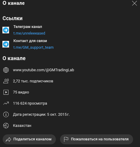 Помимо телеграм-канала у платформы по обучению студентов GM trading lab есть YouTube. Пользователей у сообщества на видеосервисе больше — 2.7+ тысяч подписчиков с 5 октября 2015 года. За почти 10 лет участники проявили активность в более 116 тысяч просмотров.| Юридическая организация онлайн-школы | На сайте нет названия управляющей компании |