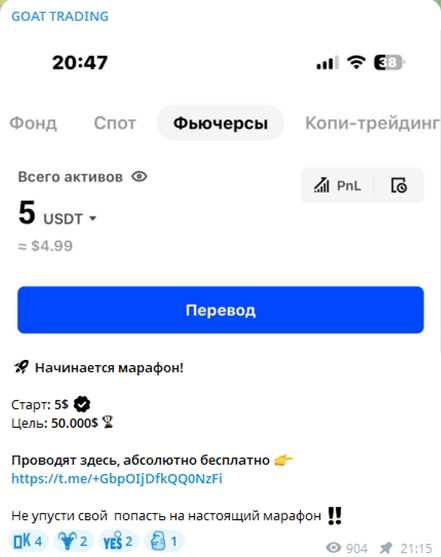 Не так давно на канале стала появляться реклама марафона. Участникам обещают раскрутку счета с 5 долларов до 50 000. Но детали не уточняются, для регистрации, следует перейти по ссылке. При этом автор не уточняет – это марафон лично от его команды или просто спонсорский контент. Так как услугу рекламы можно заказать на канале через аккаунт менеджера Goatmanagers. Но стоимость рекламных постов неизвестна.