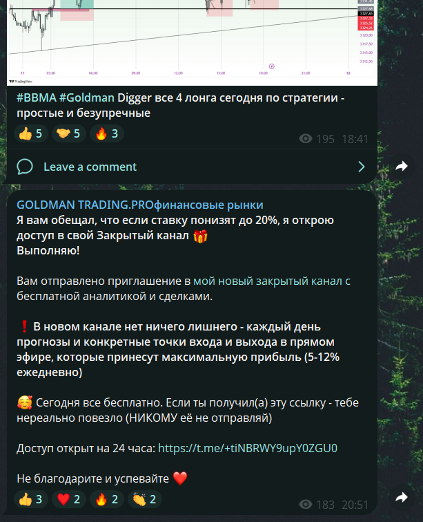 Доступ к материалам трейдера полностью бесплатный. Однако часто в ленте канала можно встретить рекламу платных проектов. Прямого отношения к деятельности Goldman Trading они не имеют, поэтому автор канала не несет за них ответственности.