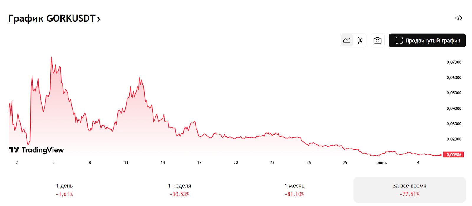 После громкого старта и множества восторженных публикаций в последние дни не слышно новостей о token Gork (утч. не мем коин, монета), а курс Gorkusdt оставляет желать лучшего. После старта торгов на биржах в начале мая он быстро вырос, однако в первых числах июня упал практически до нуля. Токен торгуется на уровне порядка 0.00976 USDT, при этом первоначально стоил 0.03810.
