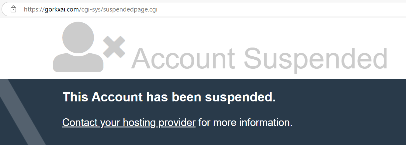 Домен официального сайта криптовалюты токена «Горк» (не мемкоина) Gorkxai com зарегистрирован в мае 2025 г. Мы не смогли зайти на него, данные актуальны на июнь этого же года, на нем появляется следующее сообщение: «This Account has been suspended».
