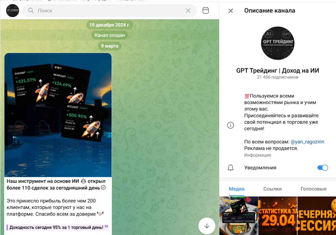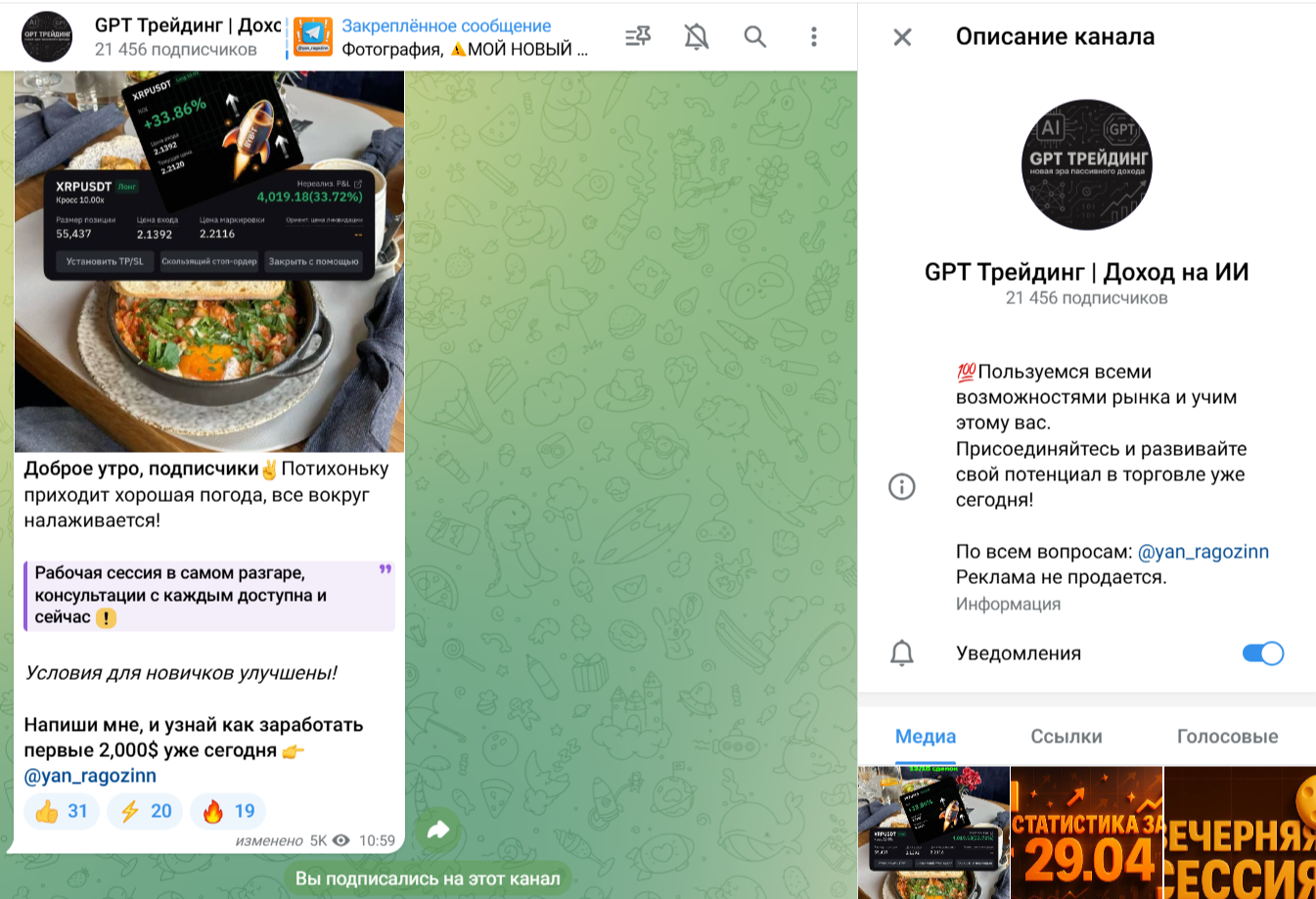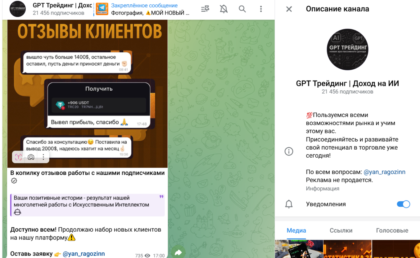 Обзор канала в Телеграме «GPT Трейдинг Доход на ИИ»: анализ деятельности трейдера Ян Рагозин и отзывы реальных подписчиков