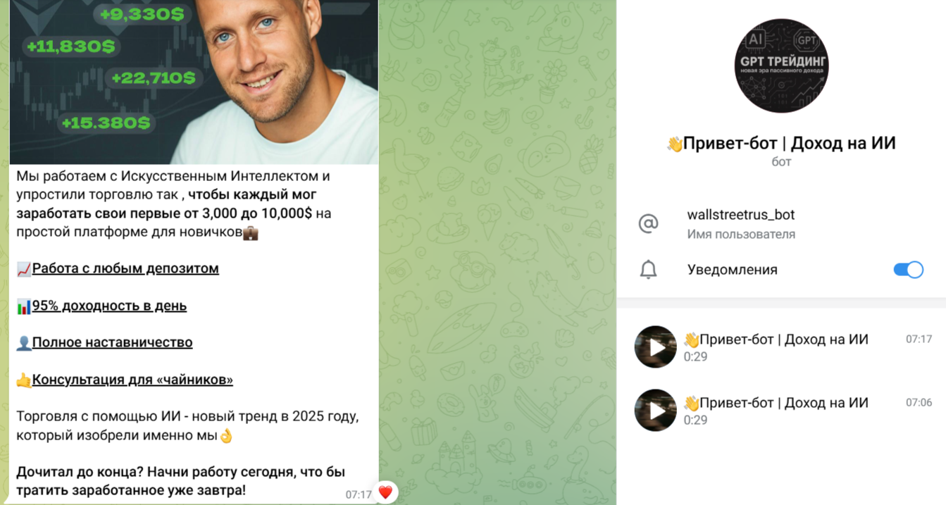 Канал «GPT Трейдинг Доход на ИИ» и его автор не рекомендованы нашим читателям. Велики риски остаться без средств. Планируете получать прибыль от пассивного дохода – обращайтесь за помощью к опытным экспертам. Каким – полезную информацию о настоящих профессионалах вы найдете в наших обзорах.