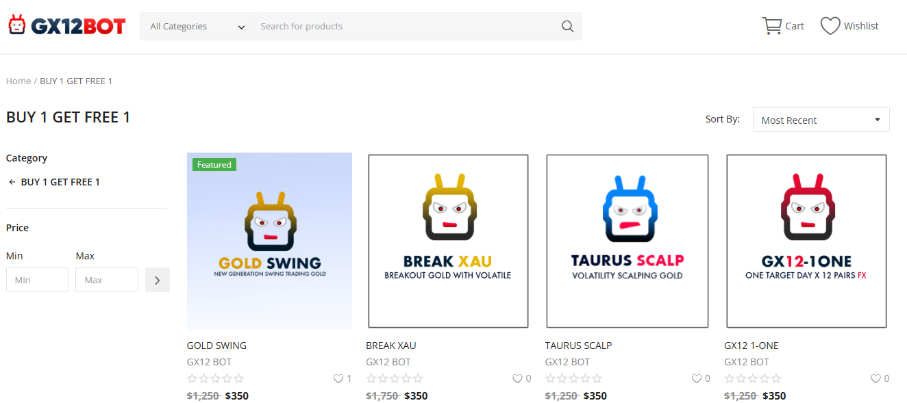 GX12 Scalper EA и другие боты от разработчика GX12 BOT продаются по фиксированной цене $350. Ранее на сайте указывалась цена от $1 250 до $1 750 в зависимости от продукта. Однако в настоящий момент действует постоянная скидка. И все продукты продаются по единой стоимости: