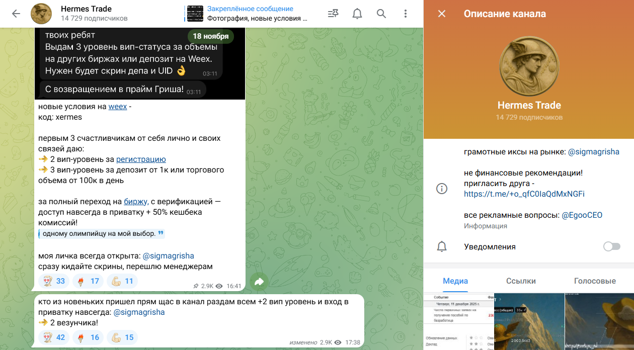 Единственная достоверная информация о Гермесе в его телеграм канале, это ссылка на личный аккаунт, Sigmagrisha. В остальном он прикрепляет рефералку на криптовалютную биржу WEEX com, где есть его промокод “Xermes”, но найти профиль по этой информации не удалось. В профиле Григорий не выкладывает личные фотографии, а реальное имя может быть другим. Поэтому оценить навыки, опыт и образование автора невозможно, а к его заявлениям нужно относиться скептически.