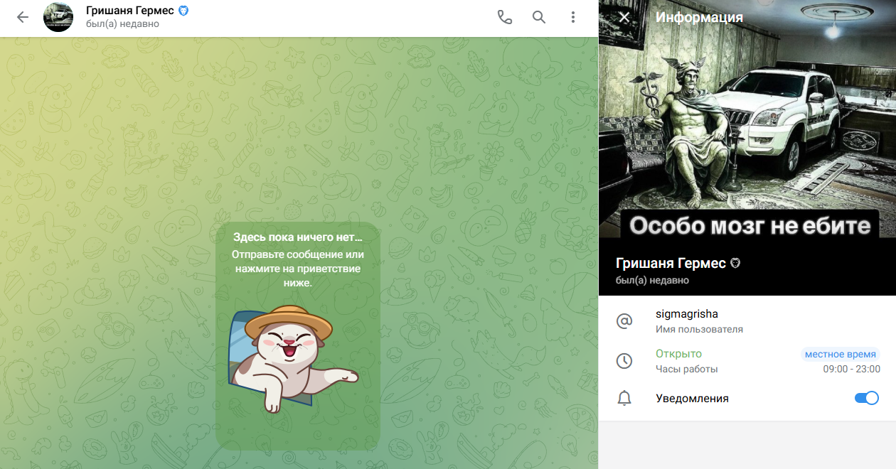 Несмотря на работу телеграм канала с 2021 года, его реальный владелец менялся не один раз. Об этом говорят длительные паузы между некоторыми публикациями, смена подхода к ведению ленты, а также реклама разных крипто бирж. Вдобавок на протяжении всей жизни тгк можно заметить ссылки на разные профили в телеграм. Вероятнее всего новый владелец, Гриша Гермес, купил канал, чтобы быстрее раскрутить его популярность без риска блокировки. Важно учитывать, что его первые посты появились в ноябре 2025 года.