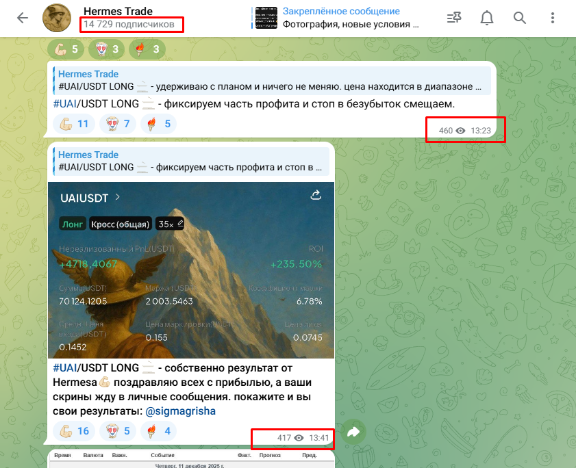 На канал Hermes Trade подписано более 14 000 человек, но как это часто бывает среди инфоцыган, около 90% из них это боты. Об этом свидетельствуют низкие охваты постов, где просмотры варьируются от 300 до 600 единиц. Также красным маркером могут быть закрытые комментарии, отсутствие чата. Никакого приватного сообщества он также не ведет, а значит коммуникация между участниками вообще невозможна.