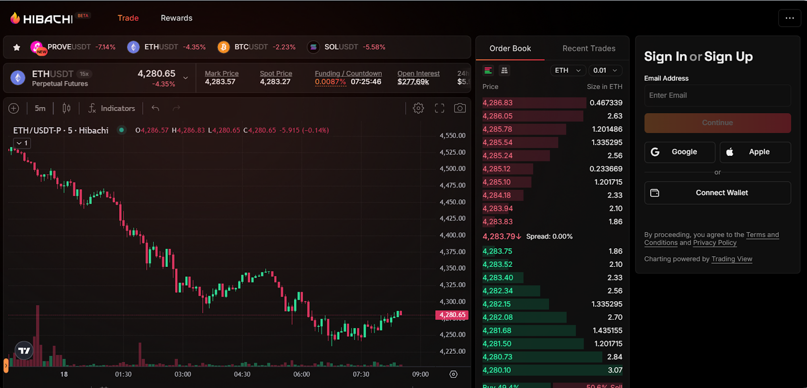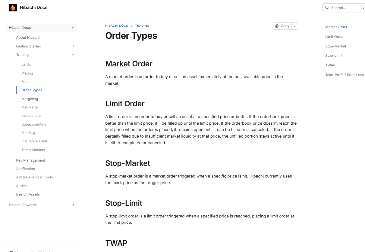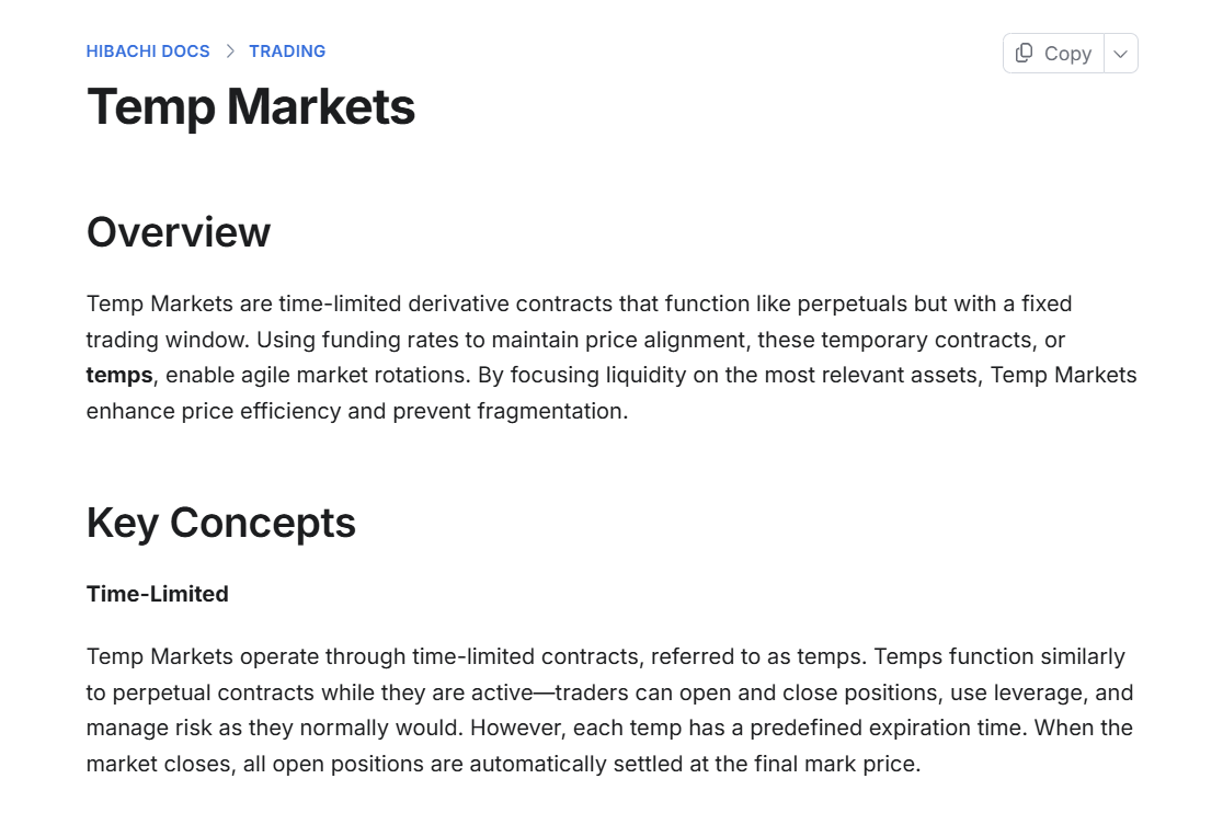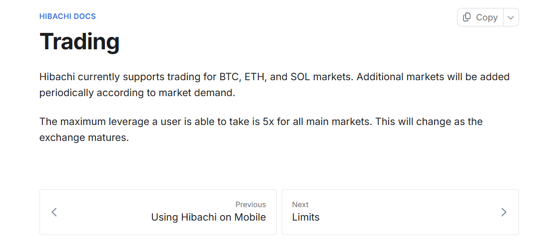 Hibachi — это не спотовая биржа. Здесь нельзя просто купить BTC или ETH в собственность, как на Binance, например. Все построено на торговле бессрочными Perpetual Futures контрактами (где ставки делаются на лонг и шорт) и Temp Markets с ограниченным сроком: максимальное плечо 5x для всех пар.