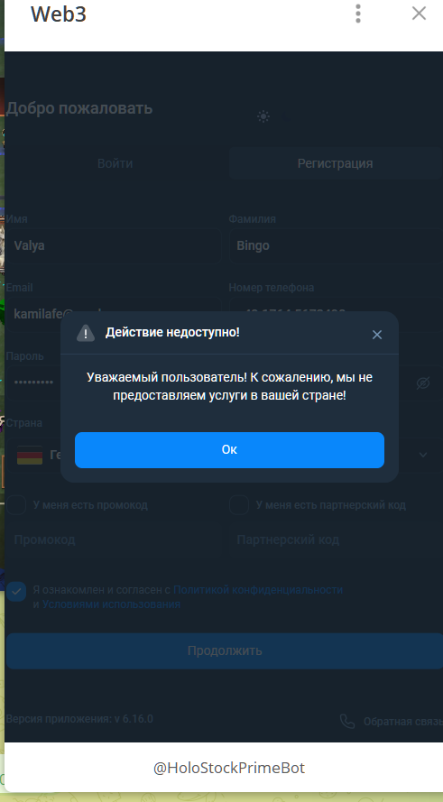 Проверка официальной регистрации, юридической информации бота Holostockprimebot