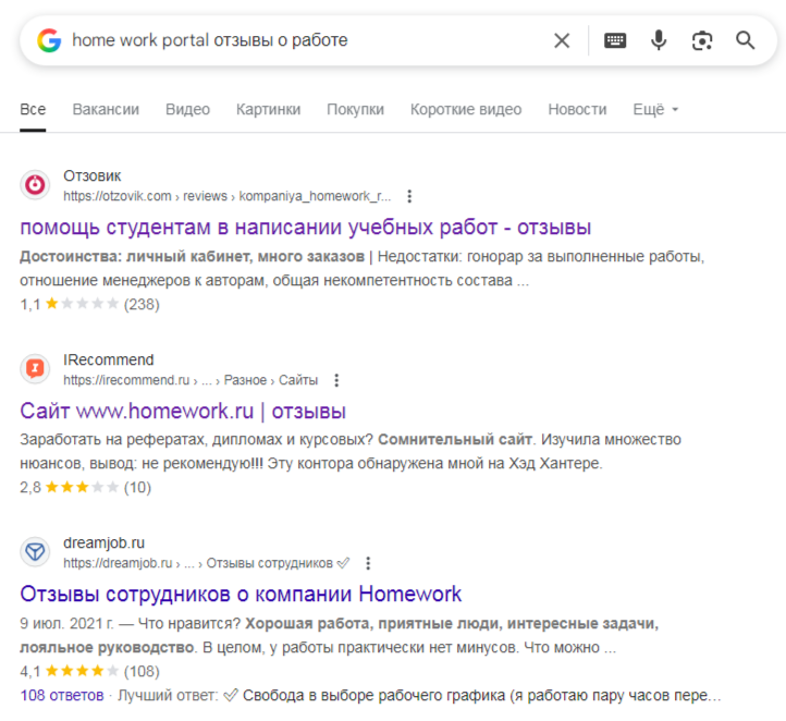 Чтобы узнать какие-нибудь подробности о работе данной организации, мы обратились к поисковику. Но здесь ее название почти нигде не упоминается. Отзывов о работе сервиса Home Work Portal тоже нет. Это довольно странно, так как ресурс был создан год назад. В сети идет речь только о проектах, схожих по названию, но к данному ресурсу они отношение не имеют.