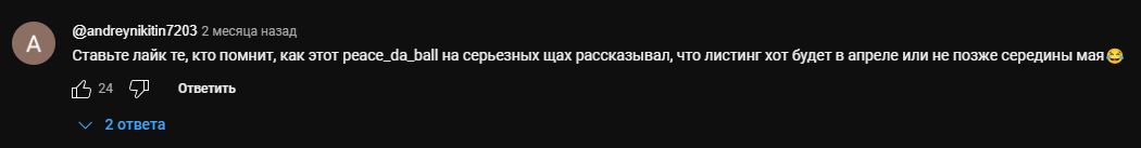 Другие комментаторы не забывают о предыдущих обещаниях листинга, который должен был состояться якобы еще весной. После этого проект пытался просто не обращать внимание на эту ситуацию и лишний раз не упоминать ее.