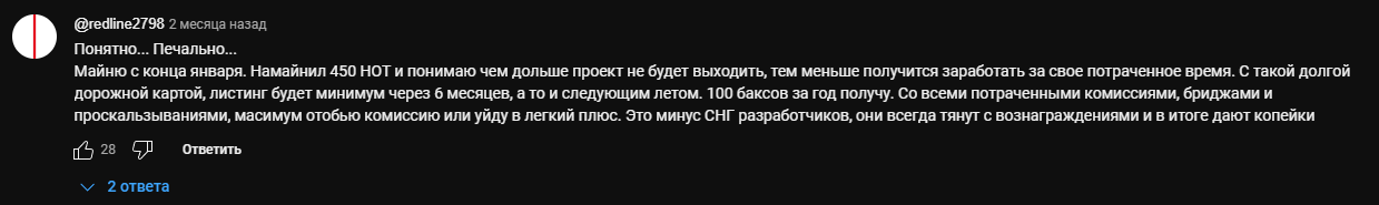 Отсутствие активности в тг от сообщества токена Хот коин дополняется различными заявлениями основателя here pasha, которые тот делал на интервью. Во-первых, им уже несколько раз устанавливались даты так и не случившегося листинга монеты. Во-вторых, в конце концов разработчик заявил, что не может назвать точных сроков, но уточнил о планомерном приближении к листингу. Но после всех этих обещаний инвесторы получили лишь трехмесячное молчание. Становится очевидно, что выход коина на биржи вряд ли вообще когда-то произойдет. По крайней мере, на данный момент все говорит именно об этом.