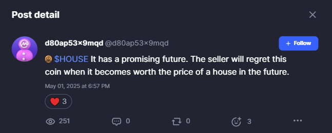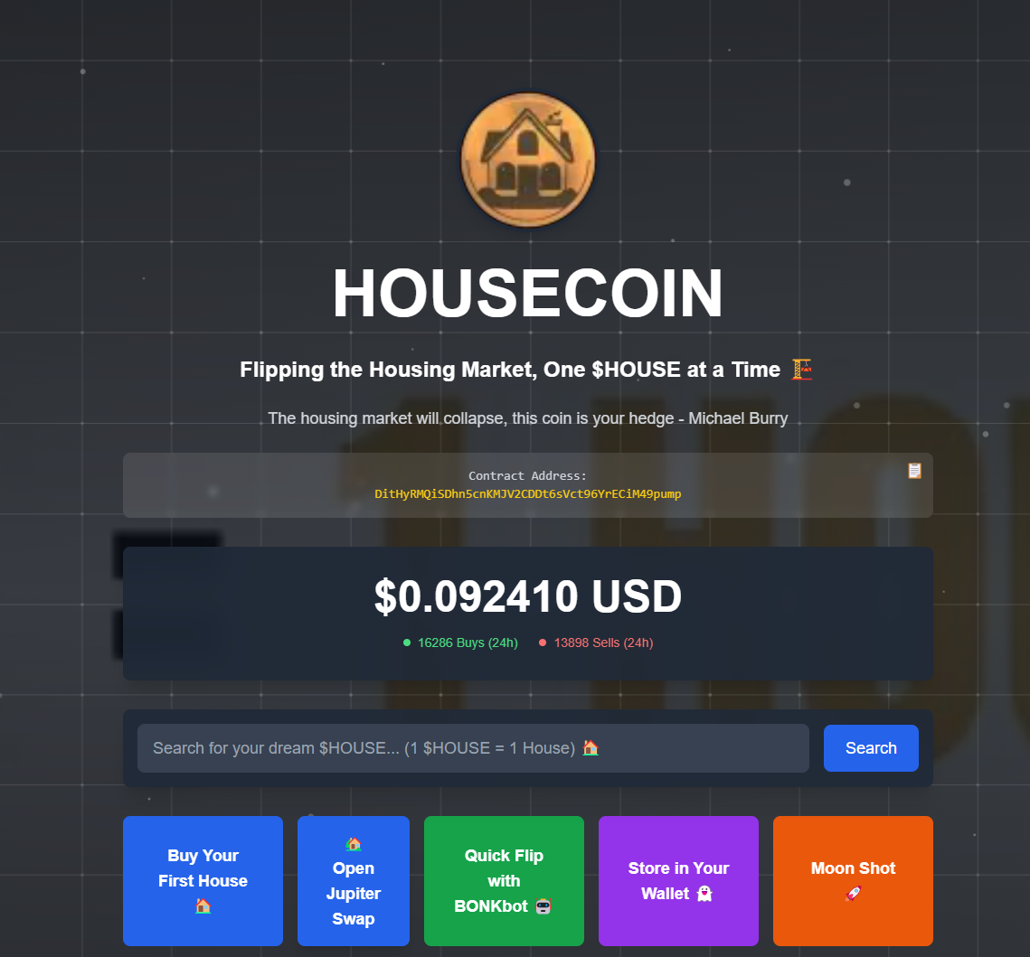 Купить монету HouseCoin в данный момент можно только через Pumpswap. При этом пользователям из России придется воспользоваться ВПН, так как регион забанен на этой бирже. В начале мая стоимость 1 токена примерно равна 10 центам. При этом маловероятно, что рост курса на этом продолжится. Ведь даже самый дорогой мемкоин DOGE на пике стоил только 73 цента. Перспективы стать мемкоином №1 у монеты House, конечно, есть, но ставить на это мало кто решится.