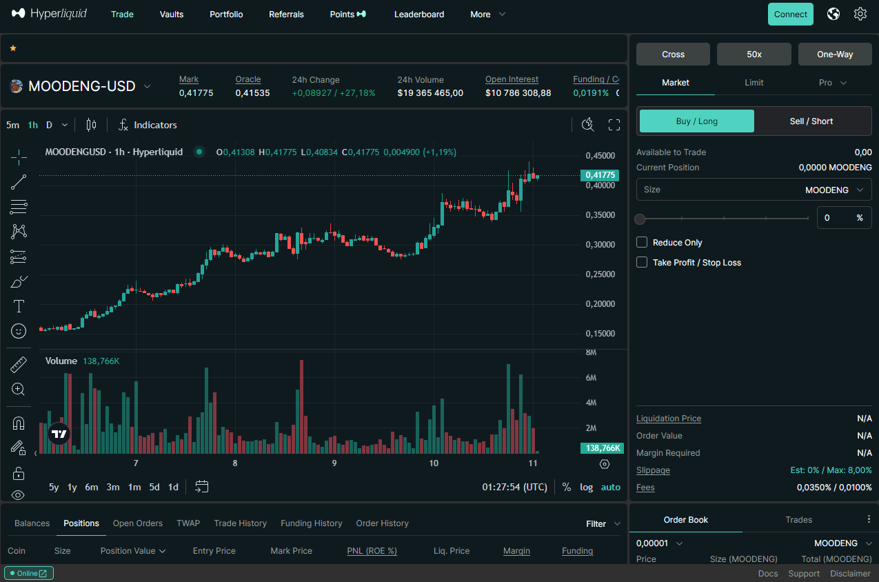 На ноябрь 2024 года объем торгов на HyperLiquid за месяц составил более $107 миллионов (1505 BTC), а средний ежесуточный объем торгов — $5 миллионов.