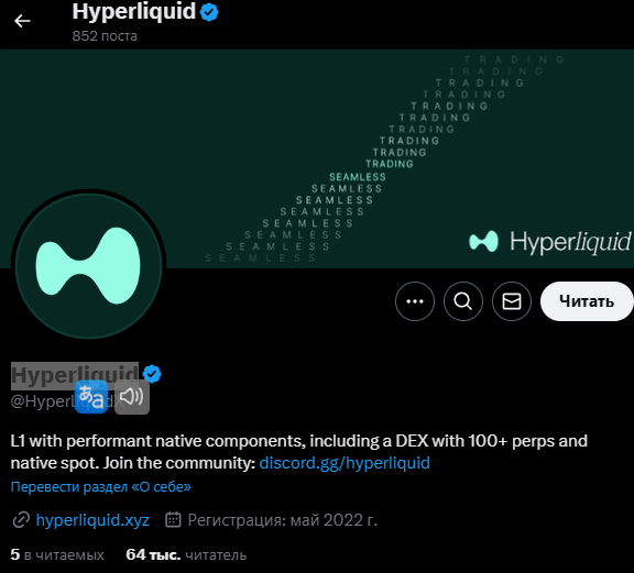 У проекта мало аккаунтов в соцсетях. Есть лишь страница Hyperliquid в Телеграме, соцсети Х, группа в Дискорде и аккаунт на Medium. Рассмотрим лишь основные группы из этого списка.