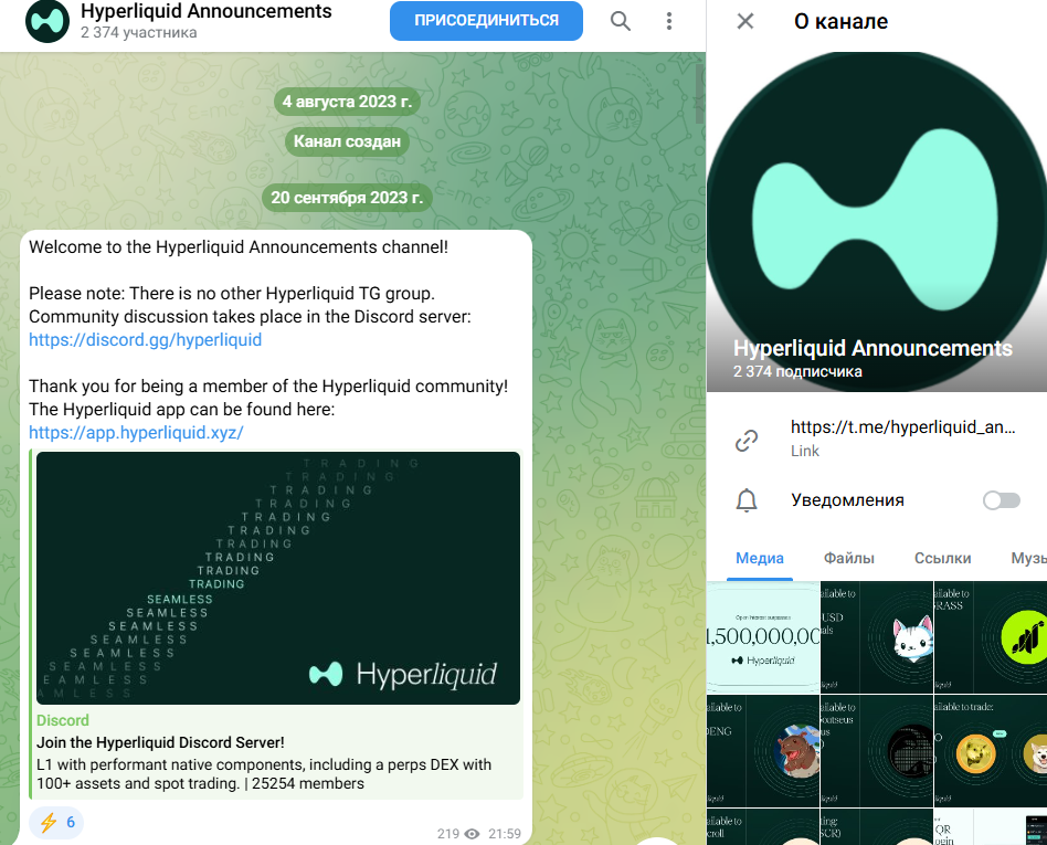ТГ-канал @hyperliquid_announcements создан летом 2023 года. В нем пока всего 2,3 тысячи подписчиков. Админы либо еще не успели накрутить аудиторию, либо не планируют накручивать. Ведь посты имеют по 2-2,5 тысячи просмотров (то есть вряд ли в канал покупали ботов).