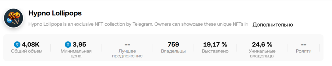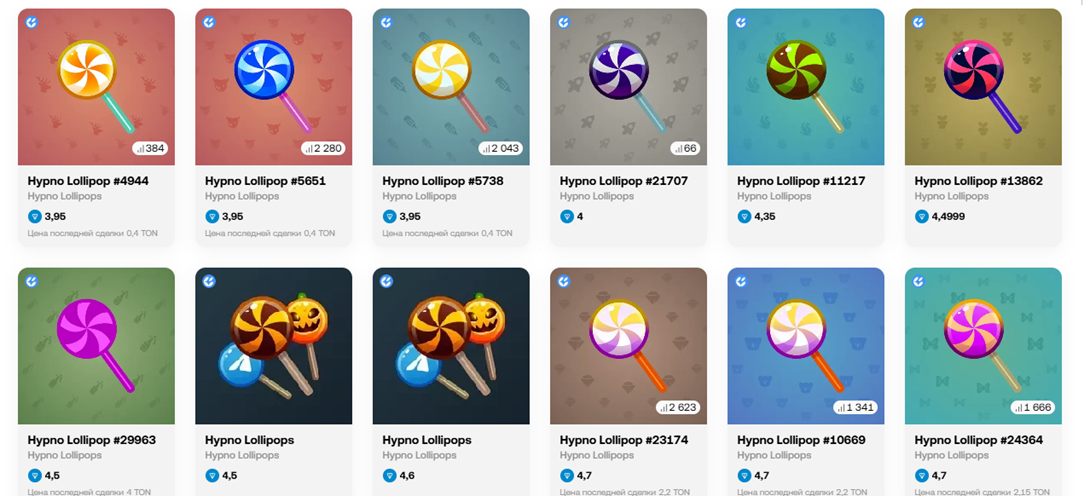 Редкие Hypno lollipop из коллекции доступны на сервисе OKX. Это говорит о том, что предметы продаются официально и не стоит подозревать, что это скам. Можно узнать предыдущую стоимость актива, количество доступных вариантов, объем торгов и прочие параметры.На текущий данный момент общий объем торгов Hypno lollipop в ТГ составляет около 4 тысяч TON. Это говорит о наличии активности. Начальная стоимость активов сейчас находится на уровне 3,95 TON, хотя ранее можно было купить Hypno lollipop за 0,4 TON. максимальная цена изображения 333333 TON. Если рассматривать, сколько стоит НФТ-подарок Hypno lollipop в среднем, то можно выделить диапазон 4-13 монет. Всего выставлено до 20% коллекции. Предметы находятся у более 700 пользователей