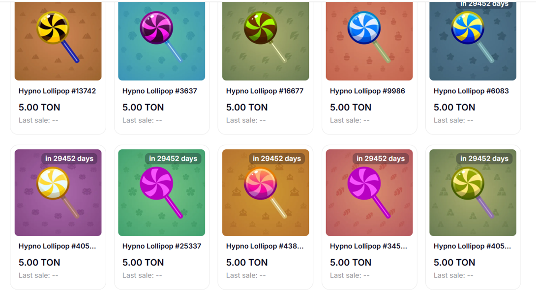 «Гипно лолипоп» является коллекцией цифровых изображений, выпускаемых в системе Telegram. Они распространяются в рамках блокчейна TON. Каждое изображение представляет собой уникальный леденец с уникальным узором и цветовой схемой. Тут присутствует стилизация под Candy-арт-игру. Hypno lollipop в Telegram доступны как подарки. Их приобретают коллекционеры и люди, желающие подчеркнуть свою индивидуальность.