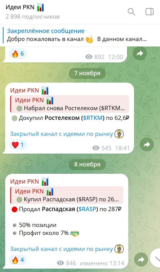 На момент написания нашего обзора у канала 5 331 подписчиков. Но просмотров гораздо меньше, а реакций, комментариев и вовсе единицы. Это говорит о том, что автор воспользовался сервисами накрутки участников.Второй канал в Телеграм – это «Идеи PKN». Здесь создатель публикует личные точки входа. Но просто делится ими, не призывая никого торговать. В этой группе 2 898 подписчиков. Просмотров больше, чем в основной, но реакций очень мало, а комментарии вовсе отключены.