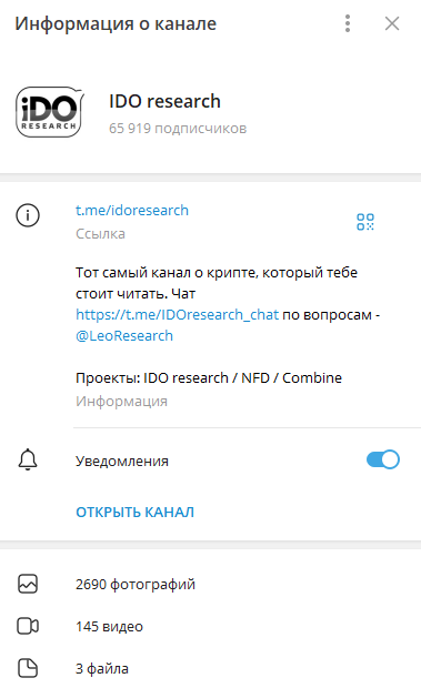 Ido Research – это новостной канал о криптовалютах. Его автор предлагает обзоры, публикует рекламные ссылки и рекламирует свой видеоблог в Ютубе. Аудитория трейдера – 62 000 человек. Для подписчиков создан Чат для общения IDOresearch_chat, а вопросы рекламы обсуждаются с @LeoResearch. Администратор не берет плату за предоставление контента – вся информация размещается в открытом доступе. Закрытых чатов не предусмотрено.