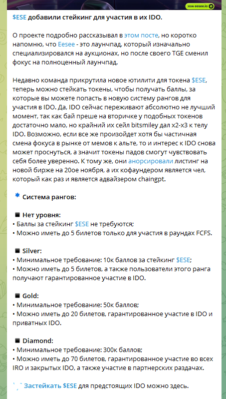 Канал ИДО Ресерч ориентирован на аудиторию, которая ищет возможности для участия в кампаниях, таких как IDO, и получения прибыли от участия в таких инициативах. Трейдеры якобы получают «инсайдерскую информацию» и советы по работе с тестовыми и новыми токенами. Но реально ничего новаторского спекулянт инвесторам не предлагает. В текстах часто акцентируется внимание на деталях, таких как условия участия, особенности стейкинга и ранговые системы.