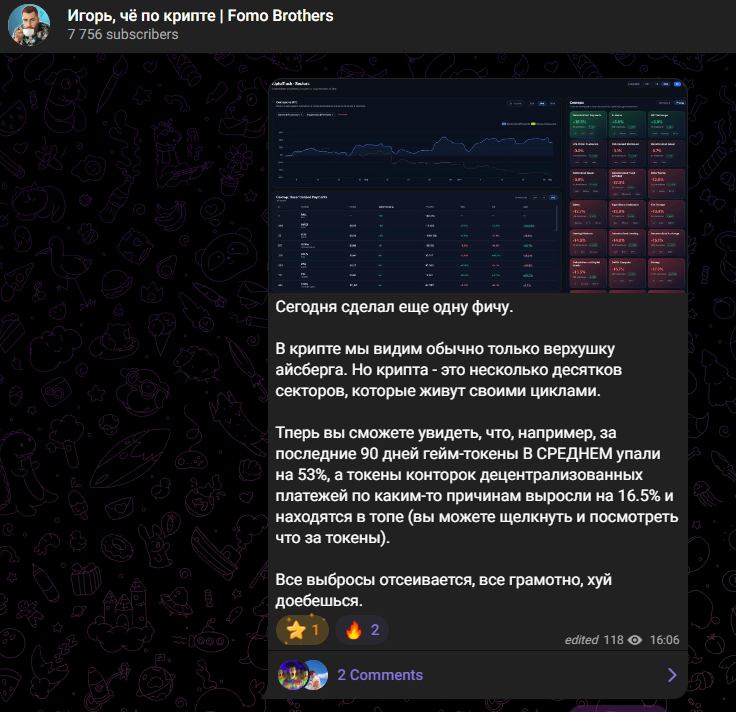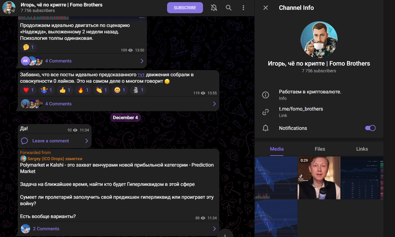 Телеграмм канал Игорь чё по крипте Fomo Brothers — личный блог трейдера, в котором он анализирует криптовалютный рынок, выкладывает свои прогнозы и разрабатывает софт для торговли. Платных услуг нет и не было за всю историю проекта, напротив, автор высмеивает проекты, которые продают сигналы или обучение. В статье расскажем, какой контент пользователи могут найти в канале, и выясним, стоит ли тратить на него время.
