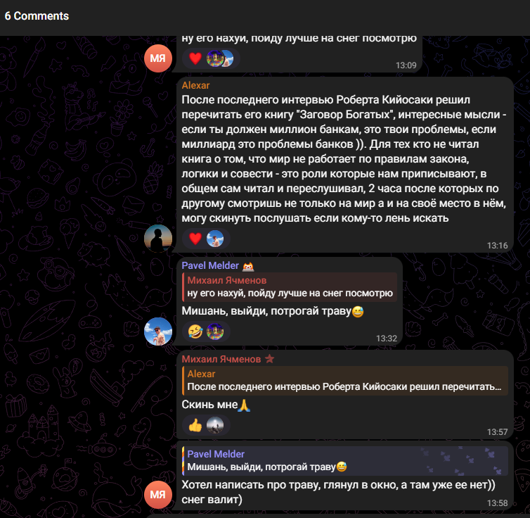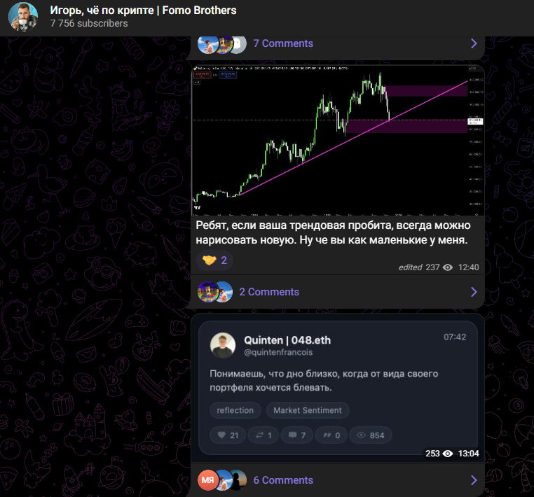 Автор канала Fomo Brothers часто репостит записи других проектов и приглашает подписчиков к обсуждению тезисов. Чаще всего трейдер не согласен с утверждениями и пытается найти аргументы для их опровержения. В сообществе не редко мелькают скриншоты аккаунтов различных гуру трейдинга и сигналов, видно, что Игорь испытывает неприязнь к людям, стремящимся заработать не на бирже, а на неопытной аудитории.